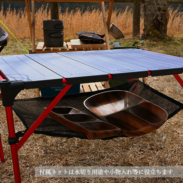 【商品説明】キャンプテーブル 赤・レジャーシーンやインテリアとしても使えるマルチテーブル・ネジや工具不要で広げるだけで簡単に組み立てができます商品特徴・付属ネットには水切り用途や小物入れとして使えます・同製品を重ねて棚として使えるマルチアイテム・専用収納ケースに入れればコンパクトに!商品詳細【素材】:アルミニウム【組立サイズ】:56×40×36【収納サイズ】:45×14×12【重量】:1.6kg【耐荷重】:約30kg【付属品】専用収納ケース、ネットトレー、ランタンポール【ブランド】WAKU FIMAC※ランタンポールの色はシルバー(画像通り)又はレッド(脚の色と同色)となります。