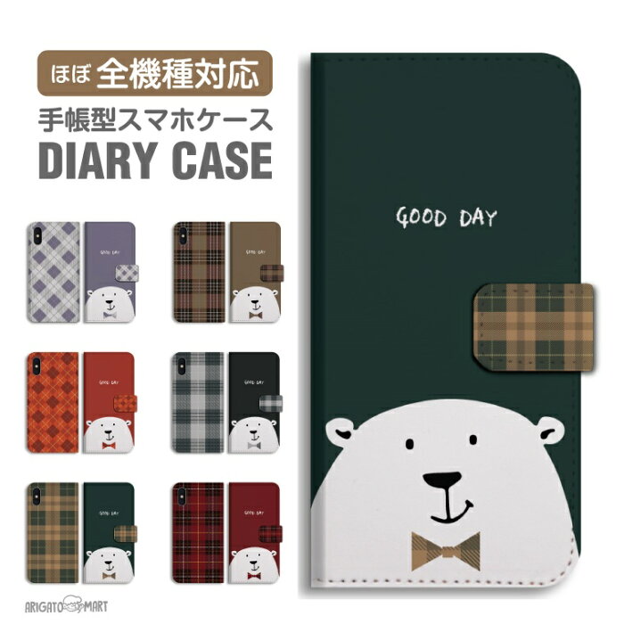 手帳型 スマホケース 全機種対応 iPhoneケース iPhone12 mini Pro iPhone11 iPhone8 iPhone SE 第2世代 XR Xperia 1 5 10 III Ace II AQUOS sense5G sense4 sense3 lite plus basic Galaxy S21 S10 A21 A20 カバー おしゃれ くま イラスト クマ 蝶ネクタイ 白くま チェック
